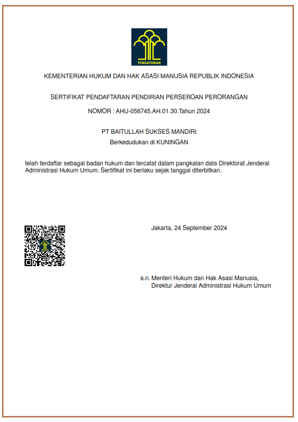 Profil Perusahaan Nama Perusahaan : PT. Baitullah Sukses Mandiri Badan Hukum : No. AHU-056745.AH.01.30 NPWP : 27.080.957.7.438.000 Alamat Perusahaan : Jl. Nusa Indah Raya No.212 Perumnas Ciporang, RT.31 RW.05 Kel.Ciporang, Kec.Kuningan, Kab.Kuningan, Jawa Barat, Indonesia Email : baitullahsuksesmandiri@gmail.com Telepon / WA : 0896 5696 1234 Rekening Bank : - BCA 299 024 8888 a/n Utris Sutrisno - BRI 0133 0101 8833 507 a/n Utris Sutrisno Direktur Perusahaan : Utris Sutrisno Domisili : Kel.Kuningan, Kec.Kuningan, Kab.Kuningan, Jawa Barat, Indonesia