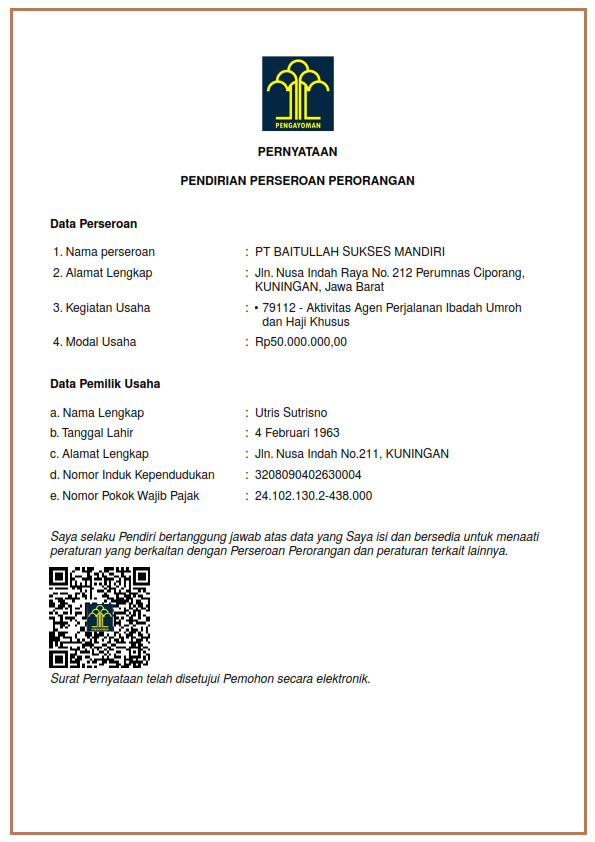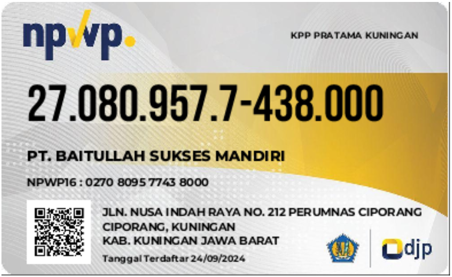 Profil Perusahaan Nama Perusahaan : PT. Baitullah Sukses Mandiri Badan Hukum : No. AHU-056745.AH.01.30 NPWP : 27.080.957.7.438.000 Alamat Perusahaan : Jl. Nusa Indah Raya No.212 Perumnas Ciporang, RT.31 RW.05 Kel.Ciporang, Kec.Kuningan, Kab.Kuningan, Jawa Barat, Indonesia Email : baitullahsuksesmandiri@gmail.com Telepon / WA : 0896 5696 1234 Rekening Bank : - BCA 299 024 8888 a/n Utris Sutrisno - BRI 0133 0101 8833 507 a/n Utris Sutrisno Direktur Perusahaan : Utris Sutrisno Domisili : Kel.Kuningan, Kec.Kuningan, Kab.Kuningan, Jawa Barat, Indonesia